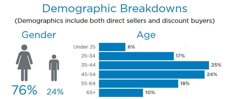 A demográfiai adatokból jól látszik, hogy a cégeknél 76%-ban nők és 24%-ban férfiak regisztrálnak. A 35-54 éves korosztály össesen 49%-ban van jelen a Network Marketingben, akik a legszélesebb réteget alkotják. A 25-34 és az 55-64 év közöttiek szinte százalékra pontosan vannak jelen ezen a területen. A 65+ korosztály 10%-ban található meg, míg a 25 év alattiak mindössze 6%-os eloszlási arányban regisztrálnak. Ha megfigyeljük ezt a statisztikát akkor, jól kitudjuk találni a célcsoportunkat és azta réteget akikre érdemes összpontosítani.