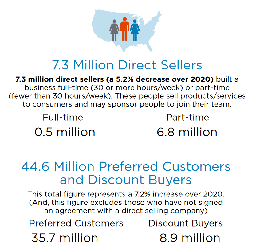 A statisztikákból látszik, hogy rengeteg ember, pontosan 44,6 millió elsőbbségi vásárló vagy diszkont vásárló a cégeknél, ami 7,2%-al több mint 2020-ban. Összesen 35,7 millió elsőbbségi vásárló van nyilvántartva a Network Marketing cégeknél az USA-ban. 8,9 millióan diszkont vásárlónak minősülnek, akik nagyobb kedvezménnyel jutnak hozzá a termékekhez, de nem érdekli őket a hálózatépítés.