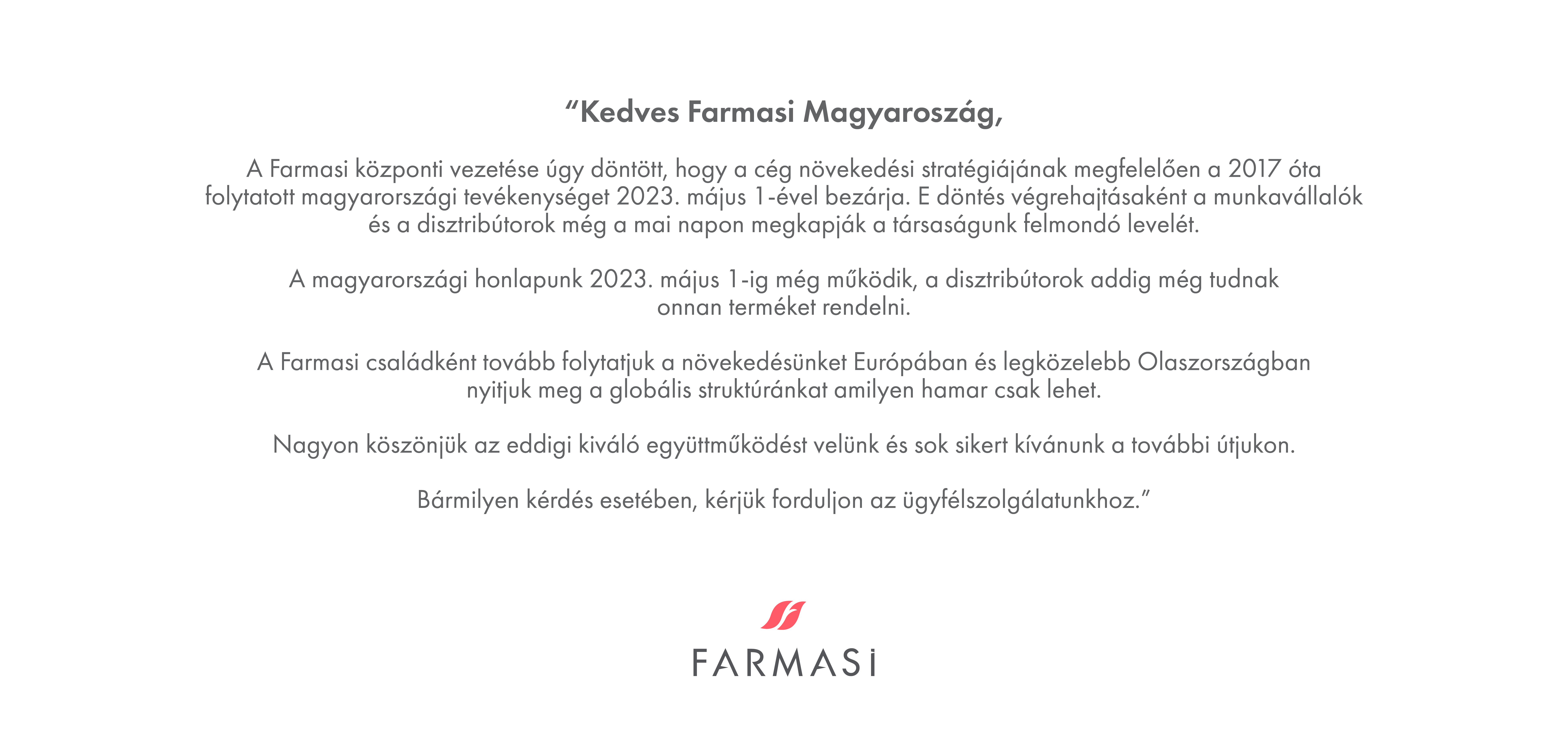 A Farmasi központ vezetése úgy döntött, hogy 2023. május 1-ével megszüntetti magyarországi tevékenységét.