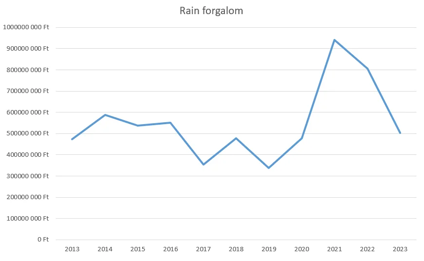 Az adatokból jól látható, hogy a Rain ezt a forgalom növekedést nem tudta megtartani és egy erős zuhanó pályára került, aminek következtében 2022-ben -14,5%-al, 2023-ban további -37,5%-al zárt és a 10 évvel ezelőtti szintre süllyedt vissza.